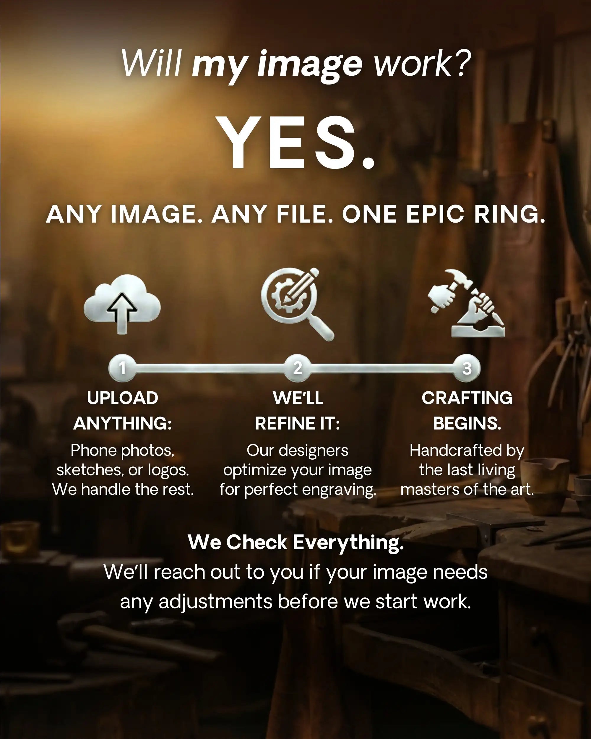 Screenshots, sketches, old photos, tattoos, hand-drawn ideas. If it matters to you, we can engrave it. Our team reviews every design to make sure it translates well to metal.