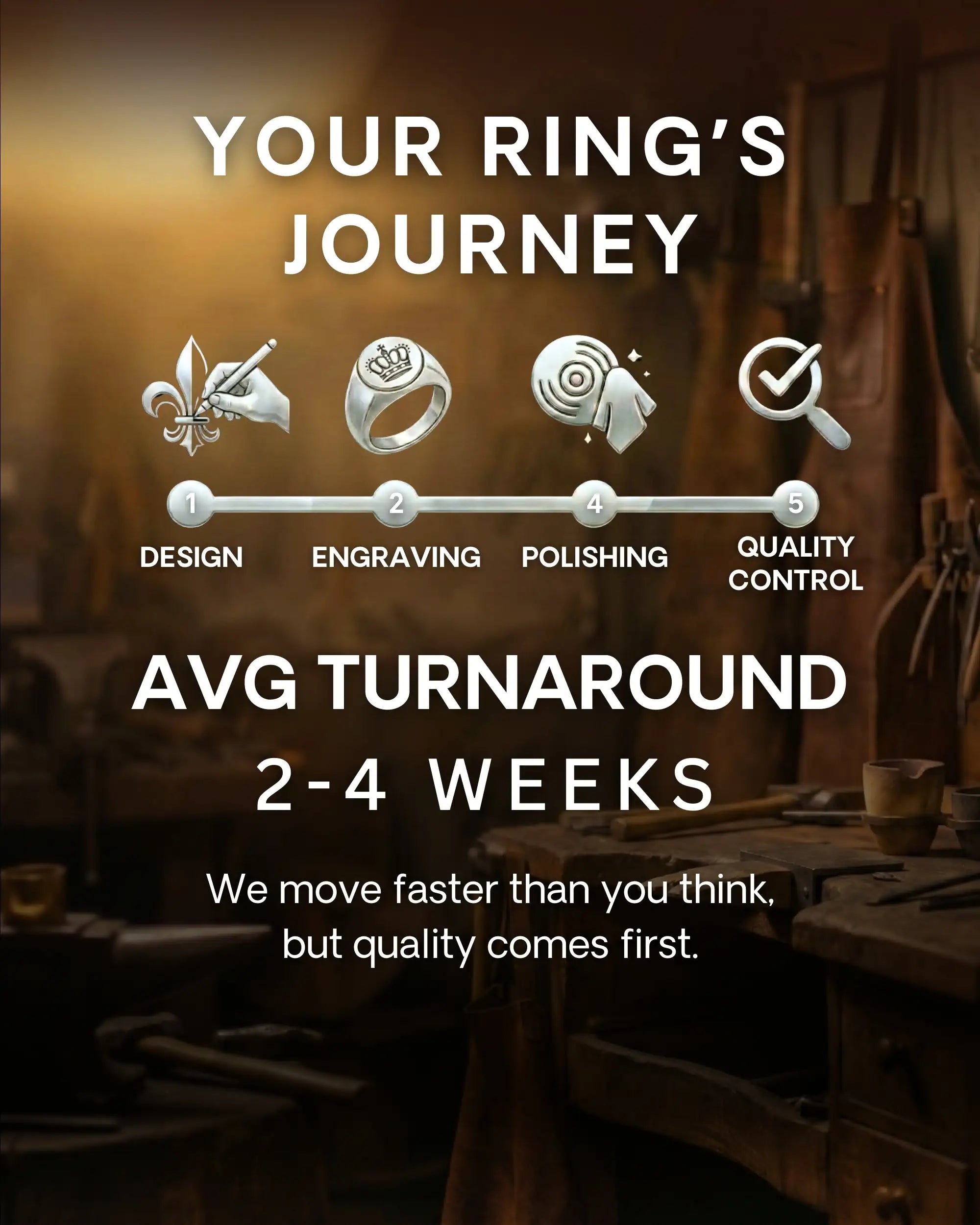 Most custom rings are completed and shipped within 2-3 weeks. Rush options are available if you need it sooner. Every ring is made to order; we don't pull from stock, we craft yours from the ground up.